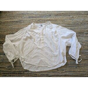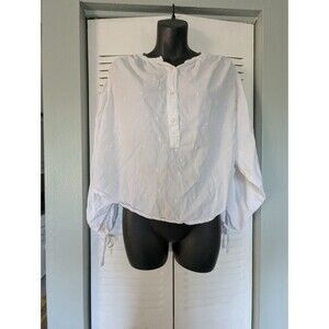 This is an Old Navy women's Henley top in size Small, featuring a white Swiss dot pattern and made from 100% cotton material. The top has a Henley neckline and long puff sleeves, giving it a relaxed fit. The style is a long crop length, making it a trendy and versatile piece for any casual outfit. Perfect for adding a touch of texture and style to your wardrobe.