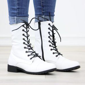 White Synthetic Leather Low Heel Round Toe Above Ankle Combat Boots Laced Up