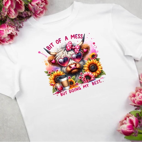This playful white t-shirt features a colorful cow design, perfect for adding a touch of fun to any outfit. Ideal for people who love vibrant prints.