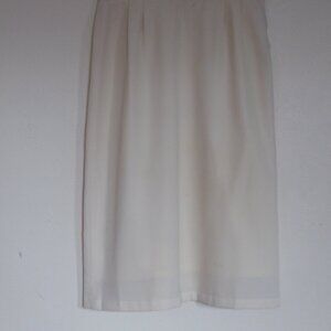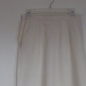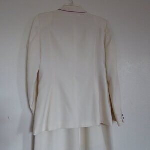 Beautiful fully lined tailored cream-colored suit with purple striping accent and buttons. Perfect for wedding or formal event. Fully lined skirt is narrow pencil style with a few tuck pleats in front waistband. Side zipper. Back of skirt has 9 inch opening pleat. and is 27 inches from waist to hem. Sits at natural waist. Jacket is fully lined and 27 inches from neck to hem. 4 purple buttons on front accent the purple piping that accents the jacket. 2 purple buttons in each sleeve as well. 2 front slash pockets. Elegant and sophisticated style. Size says 10 but is more like an 8.