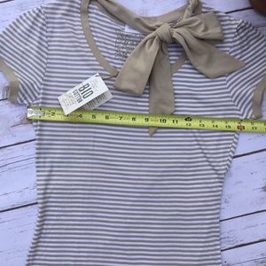 This striped organic cotton t-shirt with short sleeves comes NWT. Can be worn with or without the detachable tie. 100% cotton. Size Small, measures 16 inches across from armpit to armpit and 24 inches in length.