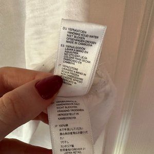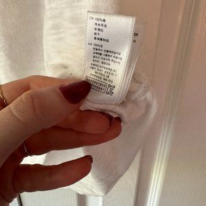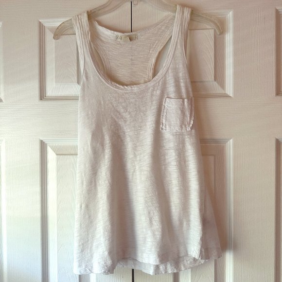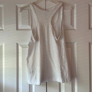 Pre-owned. Very good condition. Lightweight white heather racerback tank top. Has a pocket on the left side of the chest. Size Large (I'm typically a size small-medium in shirts).