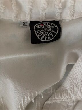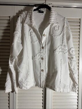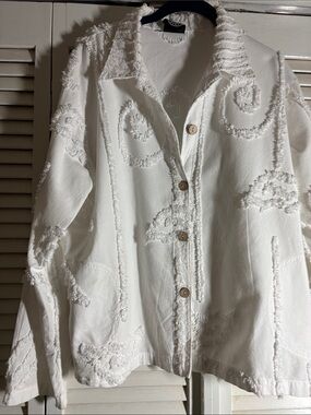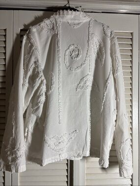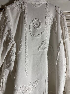 White button-front women's top with textured fringe swirl detailing. Designed for a relaxed, elegant fit that layers easily. Lightweight fabric with a soft, tactile finish for everyday wear. Easy-care style that elevates casual and dressy looks. Pockets. 24 inches pit to pit. 24 inches shoulder to hem. Wooden buttons. Tags pictured.