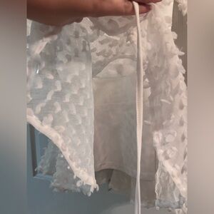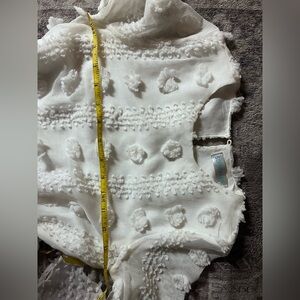 Smoke free, WORN ONCE. Fits size 6-8. No stretch. Belt included (removeable), can tie in front or back. Elegant white dress with textured details and ruffle hem. Perfect for special occasions.