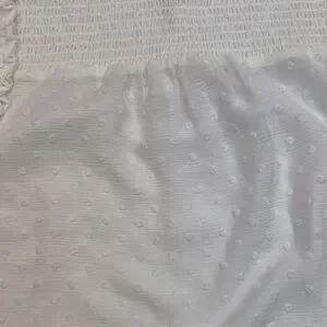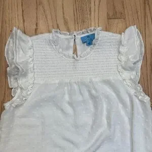 Adorable white top with ruffle sleeves. Textured Swiss dot fabric adds charm.