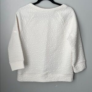 Stylish white textured sweatshirt with a classic design. 3/4 length sleeves. Raglan cut sleeve.