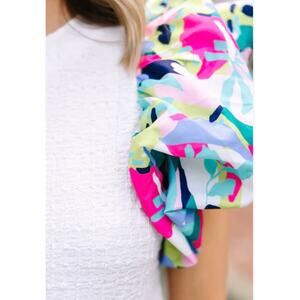 Brighten up your wardrobe with this playful and feminine THML blouse featuring structured puff sleeves in a vibrant abstract print. The body is a textured white fabric with subtle stretch for comfort. A standout top for brunches, parties, or whenever you want to make a statement.