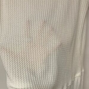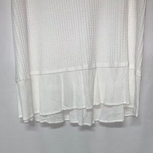 Chico's sleeveless tank top in a crisp white with a textured design. Features a flattering V-neck and a chic layered hem. Ideal for versatile styling. Only sign of wear is the wash instructions tag on the inside of the shirt is faded as shown in pictures. Send any questions or offers!