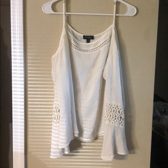Jessica Simpson, cold shoulder, lace detail, flowy sleeves, slightly used, small stain on r arm of shirt and front