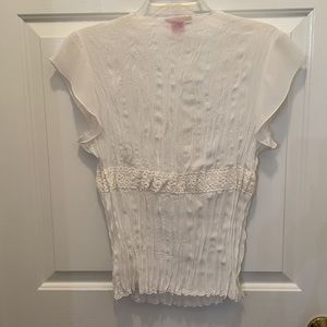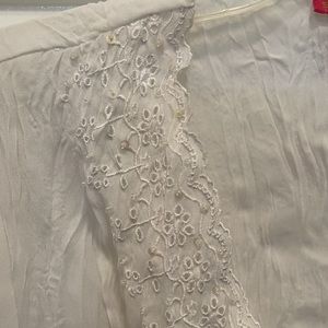 White, eyelet type lace front with crochet type band around middle. Never worn. Size L but runs small