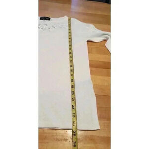 Add a touch of elegance to your wardrobe with this Bob Mackie Wearable Art sweater. The cream-colored pullover features a unique cutout neckline and arms with a rose pattern, adding a floral touch to your outfit. The 3/4 sleeves and crew neckline make it perfect for any occasion, whether you're traveling, attending a party, or just going about your day-to-day business.