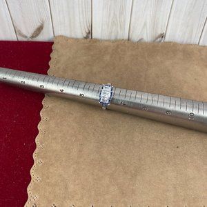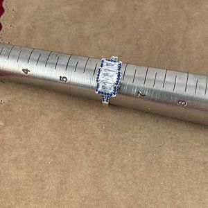 Stunning White Topaz 6x4MM Center with 5x3MM sides Radiant Cut With Halo Surround Blue Sapphires Set in a 925 Sterling Silver Setting Size 6 Ring New