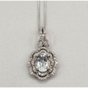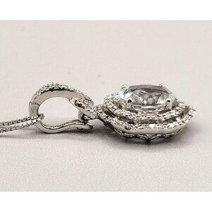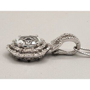 Very sparkly and blingy oval topaz stone centered in a beautiful layered sterling silver setting with additional tiny stones all around. Detachable pendant. Box chain.