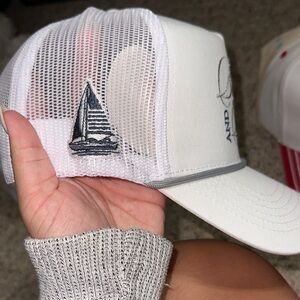 Stylish white trucker hat featuring 'Boats and Beers' embroidery. Perfect for casual outings.