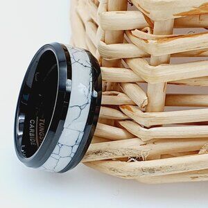 "White Tungsten Ring, Cork Inlay, Turquoise Engrave Ring, GALTUN981