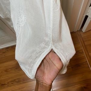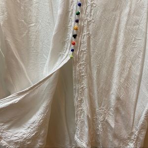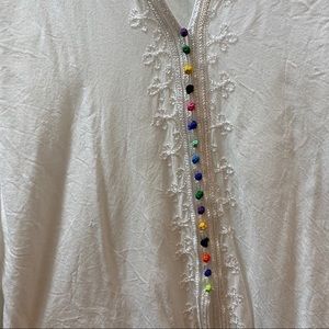 Yes, I know, I don’t own an iron ☹️ but I hope you do so you can give this Turkish-inspired tunic a happy home! It features different colored fabric balls down the front, followed by a slit. There’s detailing all on the borders, including the sleeves (pictured)
