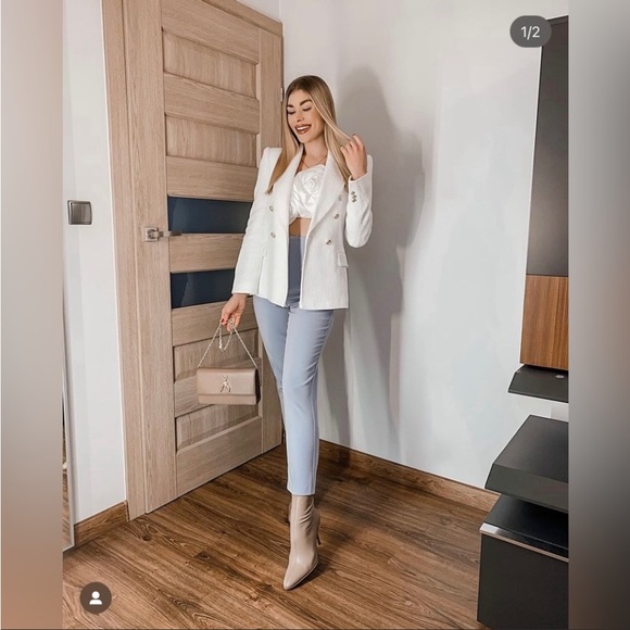 Super cute white tweed blazer — easy to pair with jeans for a smart casual look.