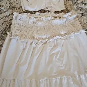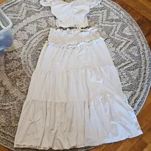 Chic white two-piece set with ruffle details. Includes a short-sleeve top and a tiered skirt.