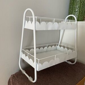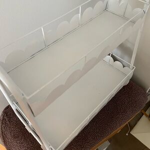 White metal 2-tier shelf. Super cute. Virtually, no signs of wear! Great for desktop, kitchen, or bath storage.