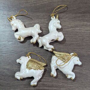 White Unicorn & Pegasus Christmas Ornaments Set Of 4 Glitter Gold Accents 3.5"