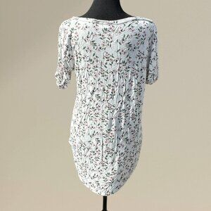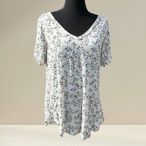 A soft and feminine top perfect for casual days or layering. Featuring a flattering V-neckline, short sleeves with subtle gathers, and a delicate allover floral print in green and pink tones on a white background. The lightweight fabric and relaxed fit make it easy to style and comfortable to wear.