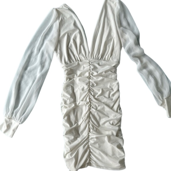 White V-Neck Long Sleeve Ruched Dress ⚪