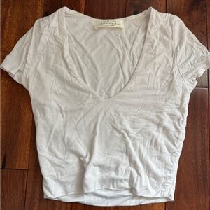 Elevate your style with this chic white V-neck top. Perfect for any occasion, this top offers a sleek and modern look. Pair it with your favorite jeans for a casual yet sophisticated outfit. Slight rip in arm out area but can easily be fixed!