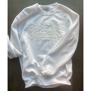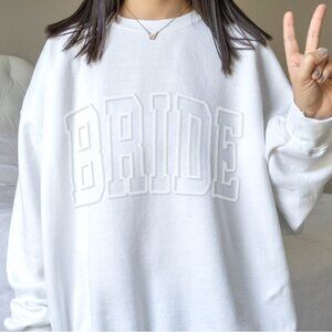Bachelorette Sweatshirt. Varsity Bride Unisex Pullover. Gift For Bride. 90s Y2K Theme Bach Classic Bride to Be 3d Raised Design Tone on Tone Gildan sweatshirt, size small • Fleece interior • 1x1 ribbed collar, cuffs and waistband with spandex • 50% cotton, 50% polyester Worn twice, like new Good condition, no stains or wear Purchased from Etsy in January 2023
