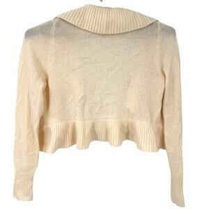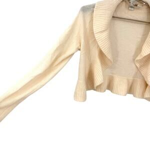 100% cashmere open ruffle sweater. Slightly cropped with long sleeves. In a beautiful off-white cream color. Size medium in excellent condition. Laid flat it measures approximately 19 inches armpit to armpit and from the top of the shoulder down the back 18 inches. And from top of the shoulder down the sleeve 26 inches.