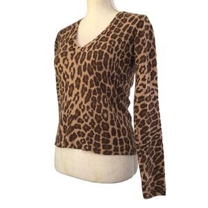 White + Warren Cashmere Sweater Leopard Print V-neck Long Sleeve Size Small