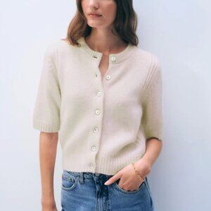 Incredibly soft ultra-light Cashmere Short Sleeve Cardigan was designed for upscale dressing with horn buttons and a slightly cropped length.