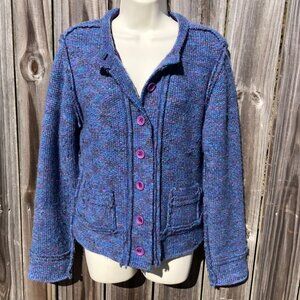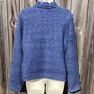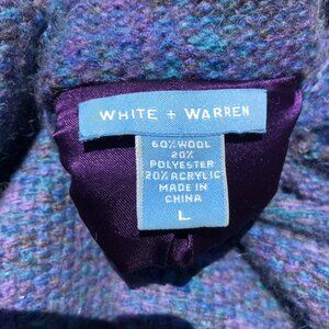 White + Warren cardigan jacket, woven in hues of blue, purple, and gray. Features full length sleeves and button down front. Two front slip pockets. Raw edge detail. 60% Wool, 20% Polyester, 20% Acrylic. Hand wash cold. Excellent condition, size large.