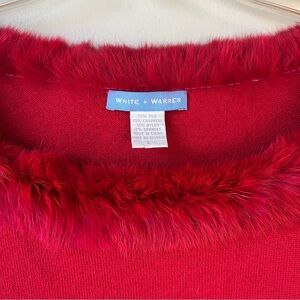 White + Warren Red Holiday Silk and Cashmere Fur Trim Sweater