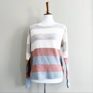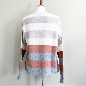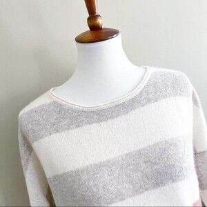 Gorgeous cashmere sweater with subltle neutral stripes. Great for layering. Hole in the last grey stripe in the center front. See last photo. I would probably have a professional remove the last stripe and leave the sweater more cropped. Not noticeable if you are tucking or wrapping on your shoulders.