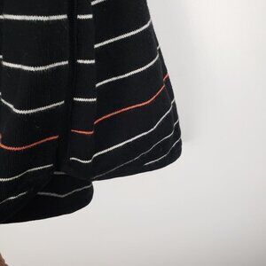 Pullover 3/4 sleeve sweater dress. Black with white and single orange stripe. Curved hem with ribbed trim that extends up sides. Boat neckline. Soft cotton, nylon, rayon, and spandex blend.