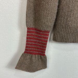 Chic taupe V-neck sweater with stylish red stripes cuff accents. Perfect for versatile wear