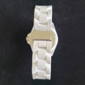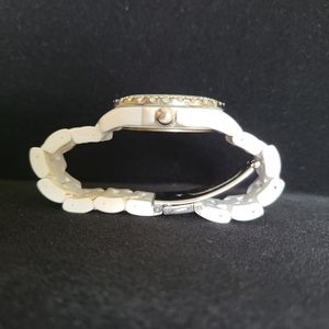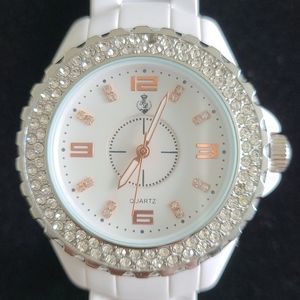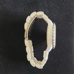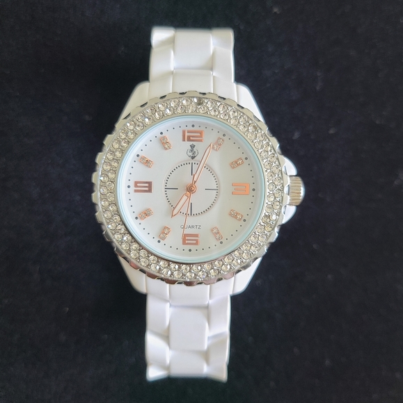 Fits a 7inch wrist. Stainless Steel back. White part is a hard plastic material. Hours and hands are rose gold. Missing a crystal (see last pic, right above #12 hour on watch) Not very noticeable at first glance or from a distance. Needs a battery. Uses standard watch battery.