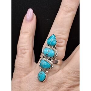 The White Water Turquoise Statement Ring is a beautiful piece of Navajo jewelry featuring a White Water Turquoise stone set in sterling silver. The ring is adjustable from a size 5.5 to a size 8. It showcases four distinct pieces of White Water Turquoise, a type known for its beautiful sky blue or "Robin's Egg Blue" color, often characterized by golden-brown matrix and water web patterns. The turquoise stones are arranged vertically along the finger, with the topmost stone appearing to be a teardrop or pear shape, followed by two oval-shaped stones and a final, slightly smaller oval at the bottom. Each stone is individually set within a silver bezel, and the bezels are further accented with a twisted rope or beaded trim, a common element in Southwestern or Native American-inspired jewelry. Its Western, Bohemian, and ethnic theme adds a touch of heritage and culture to any outfit.
