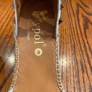 Step out in style with these chic white wedge sandals. Featuring a studded ankle strap, these wedges offer both elegance and comfort. Perfect for any occasion.