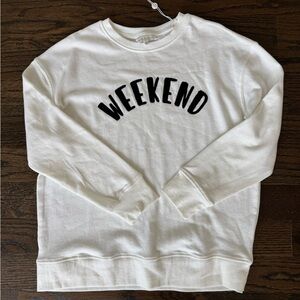 Cozy white sweatshirt with 'WEEKEND' text. Perfect for casual wear.