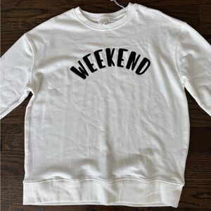 Cozy white sweatshirt with 'WEEKEND' text. Perfect for casual wear.