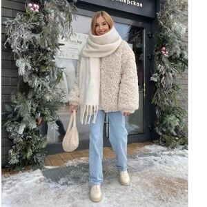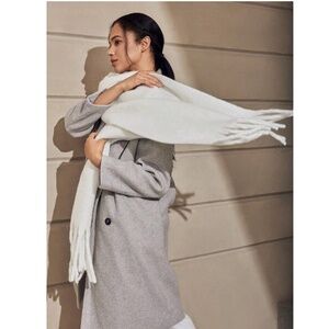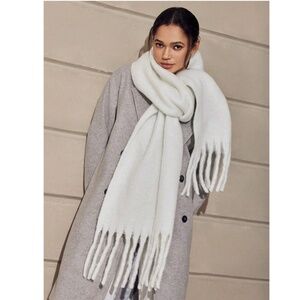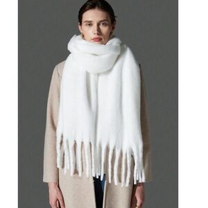 White Wide Shawl Scarf With Tassels Fuzzy Knit