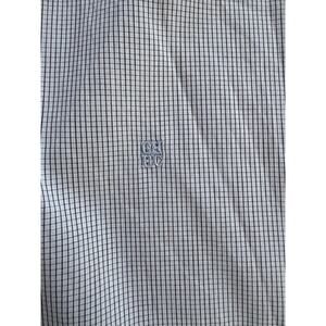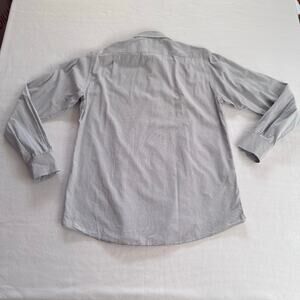 Preloved Windowpane gray on white collared, long sleeve 1 button closure, collared, no stretch fabric, casual 8 button down shirt, 1 snag on right shoulder, light discoloration at inner collar, no other stains or fabric damage