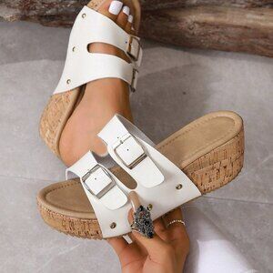 White Women's Casual Double Buckle Platform Wedge Sandals