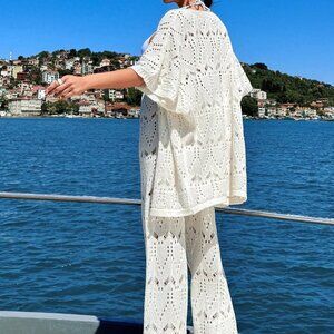 White Women's Crochet Knit Three-Quarter Sleeve Kimona And Pant Cover-Up Set