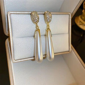 White Women's Large Teardrop Faux Pearl & Rhinestone Decor Earrings