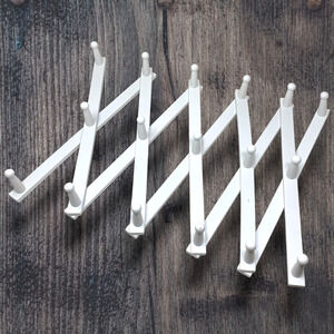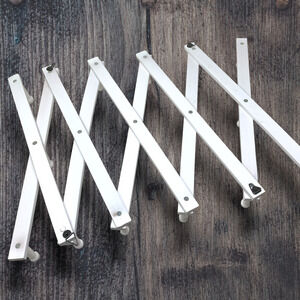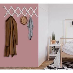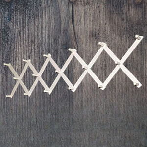The expandable coat rack is easily adjustable and can be hung horizontally or vertically; making it ideal for small spaces. Comes with 17 wooden pegs to keep your favorite items at hand, and a classic accordion wall hanger design that let you adjust the space between pegs. 15.7" high, extended up to 72" wide, 1.97" long pegs.