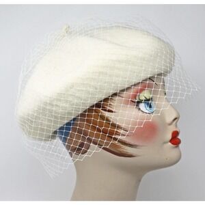 White Wool Felt Beret w Veil Netting for Church Party Retro Style Hat - Hey Viv