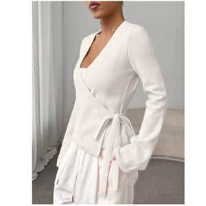 White Wrap Tie Side Cardigan Long Sleeve V-Neck