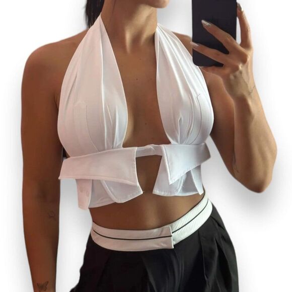 Channel all the glam vibes with this white shirt cuff halter open back crop top. This crop top is brought to you in a crisp white wrap around neck, deep v neckline with shirt cuffs button detailed, backless with adjustable back tie, cropped top! what's not to love? This halter top is here to banish any of your what-to-wear dilemmas. Great going out, club wear, streetwear, coquette, whimsical, Y2K, fairy, to boho inspired look!